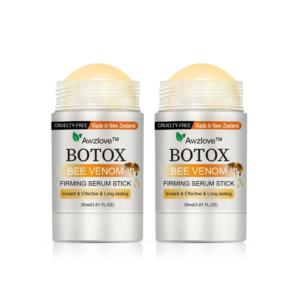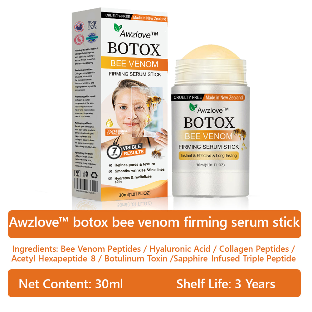 The Awzlove™ Botox Bee Venom Firming Serum Stick is an effective solution for diminishing visible signs of aging and wrinkles, resulting in a rejuvenated skin appearance within a span of 3-5 weeks. This cream incorporates scientifically proven ingredients like Sapphire-Infused Triple Peptide, Tri-Hyaluronic Acid and Micro Algae which effectively combat wrinkles and promote skin vitality.